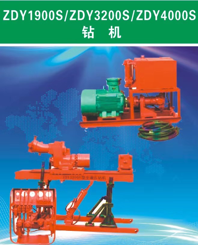 ZDY1900S/ZDY3200S/ZDY4000S 型鉆機是動力頭式全液壓鉆機,轉速范圍寬、扭矩大,能滿足煤礦井下鉆進各種用途的鉆孔,如抽放瓦斯孔,注水孔及其它工程用孔,也可用于地表工程施工。主要用于大口徑牙輪鉆進,也適用于大口徑硬質合金鉆進和沖擊回轉鉆進。